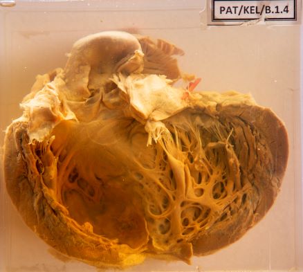 The specimen (B 1.4) displays the cut opened left ventricle of his heart.