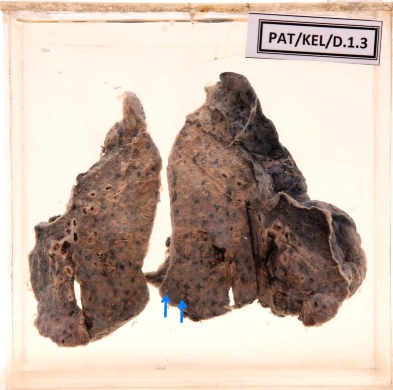 - The cut surface shows a grey colour area of consolidation with dark carbon mottling.