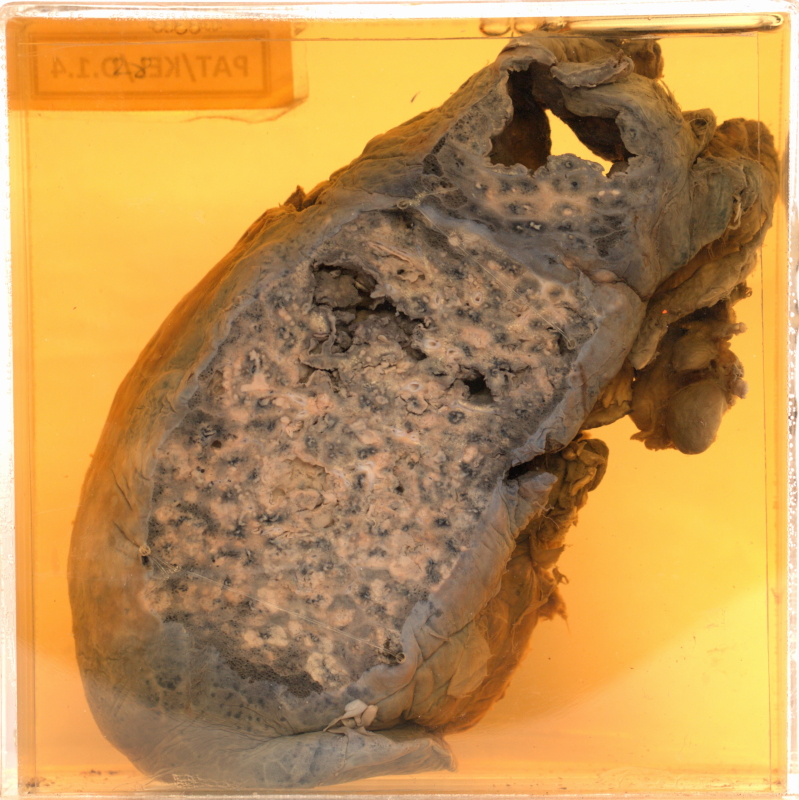 - Smaller cavities can be seen throughout the lung, with ragged, caseating walls.