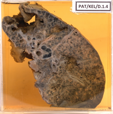 Diagnosis - Progressive secondary tuberculosis with an apical cavity and acute tuberculous bronchopneumonia.