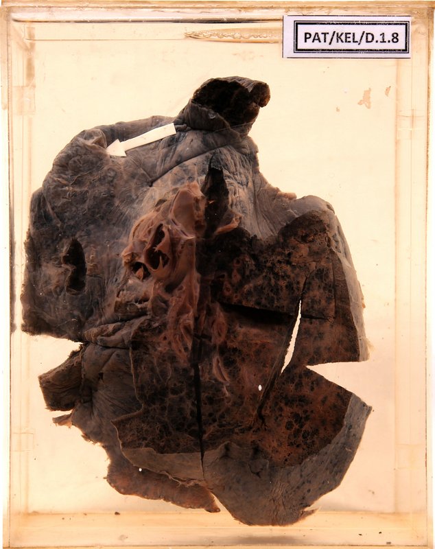 - The cut surface shows patchy grey areas of consolidation and black mottling.