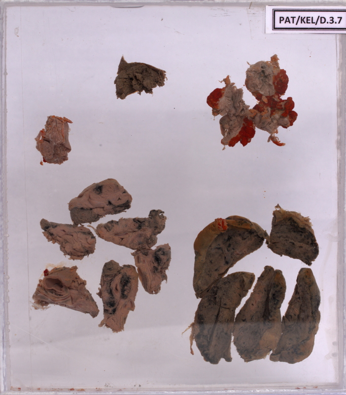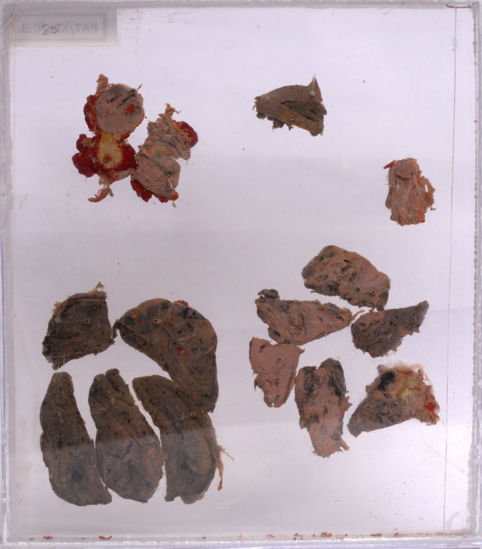 1) Left lower specimen - Apex of the lung with thick pleura. Focus of small cell carcinoma.