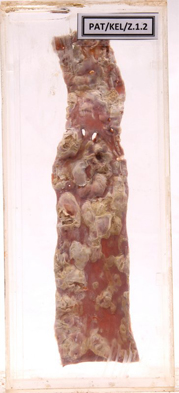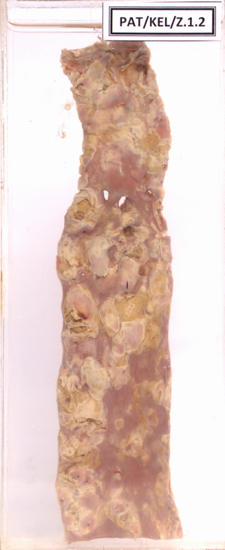 The specimen displays the descending aorta of a 70-year-old man who died following a congestive cardiac failure