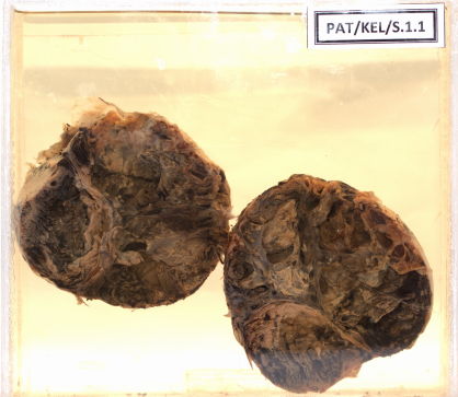 - The cut surface is variegated with dark brown, to black colour and pale white areas.