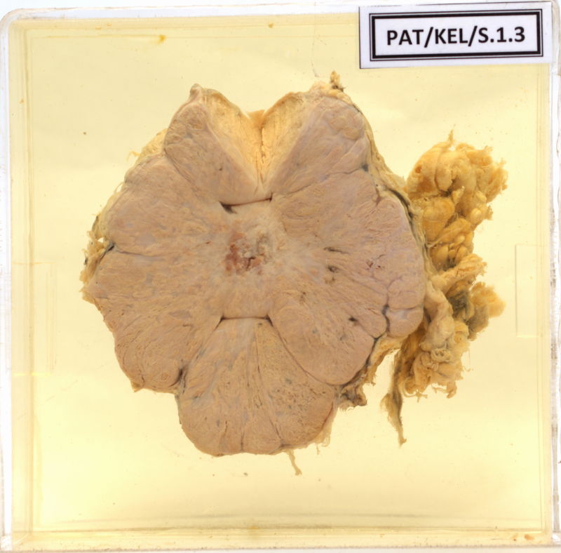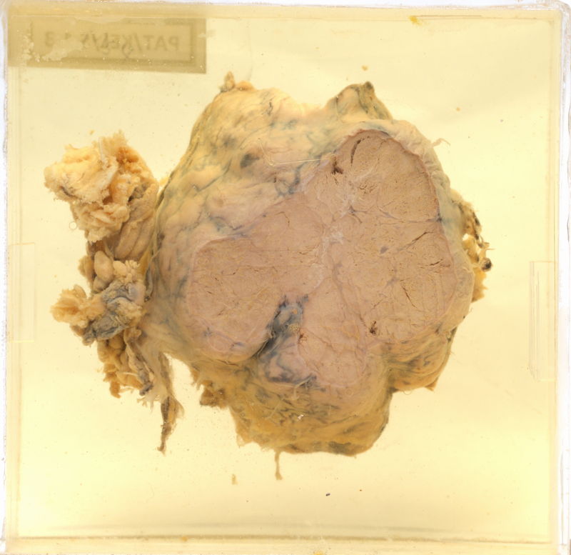 - The cut surface shows a nodular appearance and is tan to pale yellowish in colour.