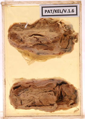 - The cut surface shows solid pale white areas some of which show glassy colloid substance.