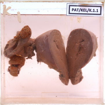 - The cut open cyst has two solid masses - one inside the cyst and the other hanging down (taken from within the cyst to show the cystic nature of the tumour).