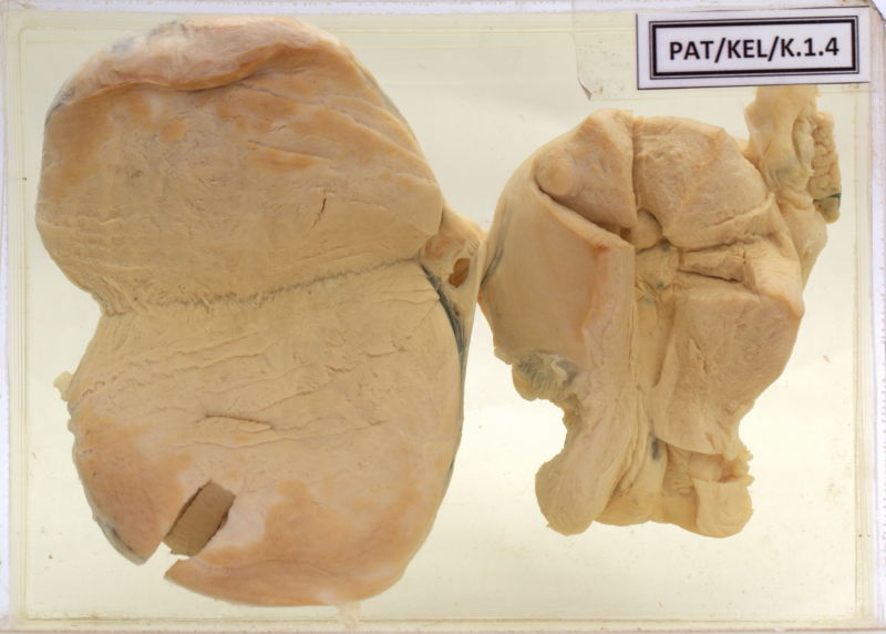 - Specimen shows an oval lump (20x10cm) arising from the right ovary.