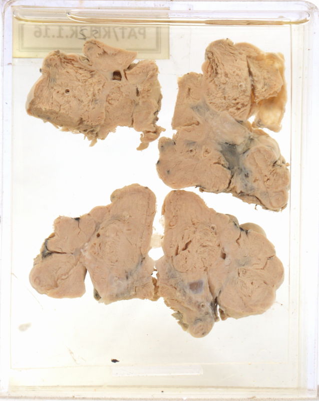 Cut section appears solid with a few cystic and haemorrhagic areas.