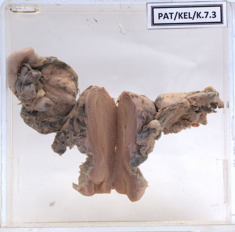 - The ovary, fallopian tube and the ligaments on both sides are bound together by fibrous tissue and the individual organs are unidentifiable.