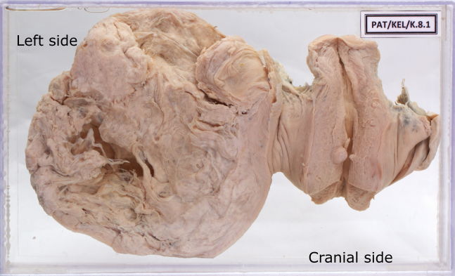 - Uterus cut opened to show a hypertrophied myometrium and a small growth in the muscle (the specimen is mounted upside down).