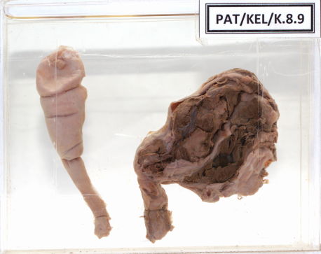 - The right fallopian tube shows distension near the distal end by haemorrhagic, necrotic mass of tissue showing areas of chorionic villi.