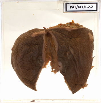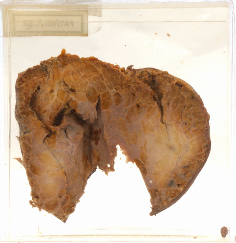 - Cut section shows an irregular, variegated mass infiltrating the whole of the breast tissue in the specimen.