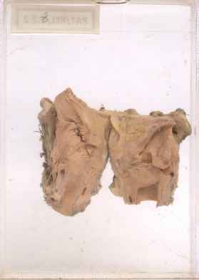 The laryngeal cartilages cannot be identified clearly as there is a homogenous, solid looking growth involving the entire larynx.