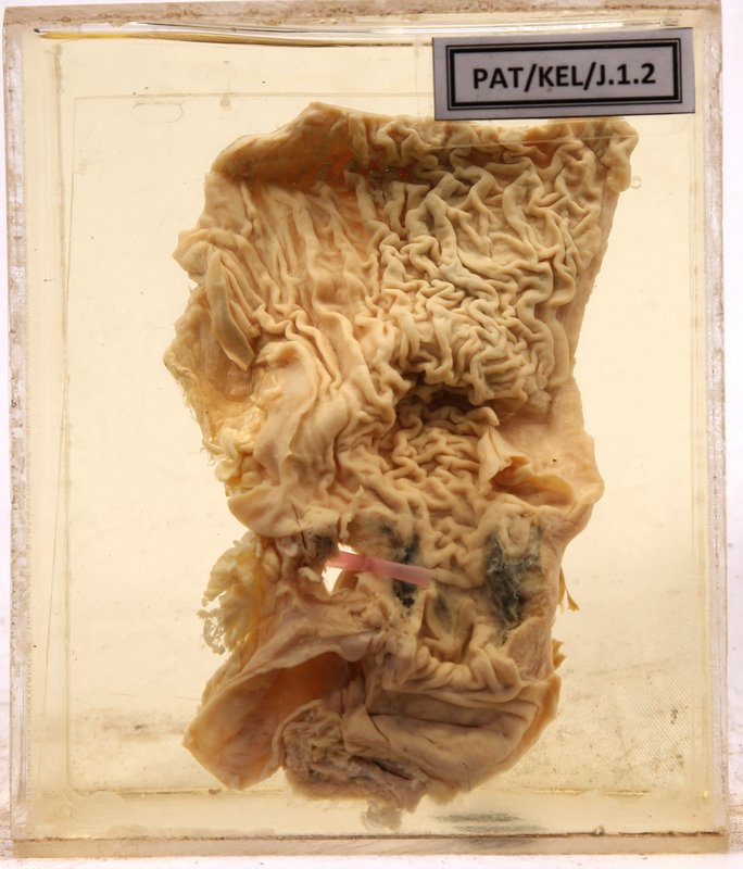 - The inner surface shows the normal rugae of the stomach mucosa.