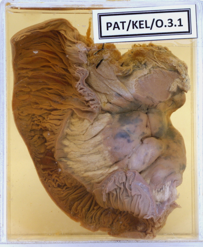 - The surface is nodular and shows some blackish areas which may be haemorrhagic.