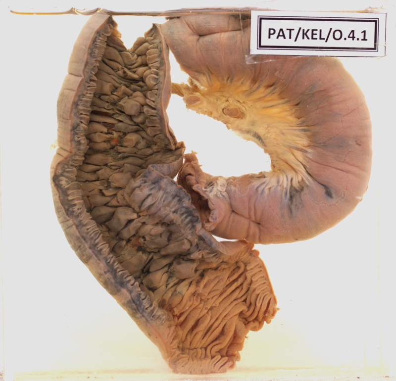 - The specimen is that of the jejunum with mesentery cut longitudinally and showing the mucosal folds which are dark in colour (hyperaemic), oedematous and in many places superficially ulcerated.