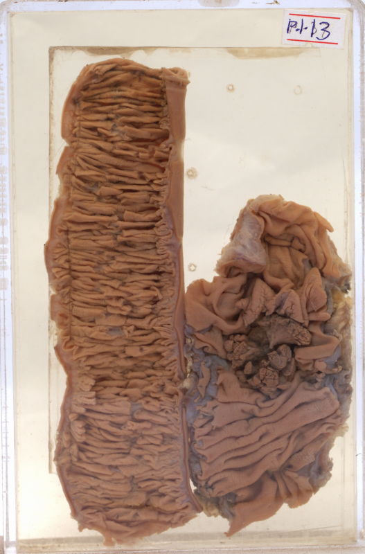 - Tumor at the ileo-caecal junction involving the adjacent bowel (a portion of the terminal ileum and proximal portion of ascending colon are displayed separately. seen on either end of the tumour)