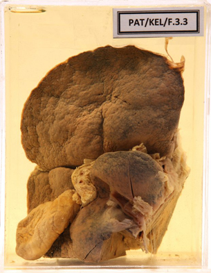 - The specimen is that of a part of the liver with the entire gall-bladder from a post-mortem.