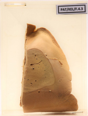 - Liver appears finely mottled with darker stained pin-point areas in a normal pale background.