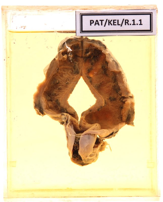 The wall is thickened and there are a number of black irregular areas on the wall.