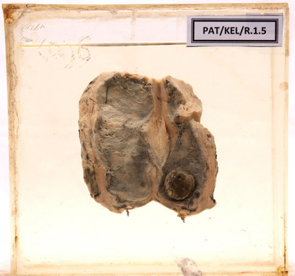 - Cut open gall bladder, contains a dark coloured stone in the lower part of the cavity.