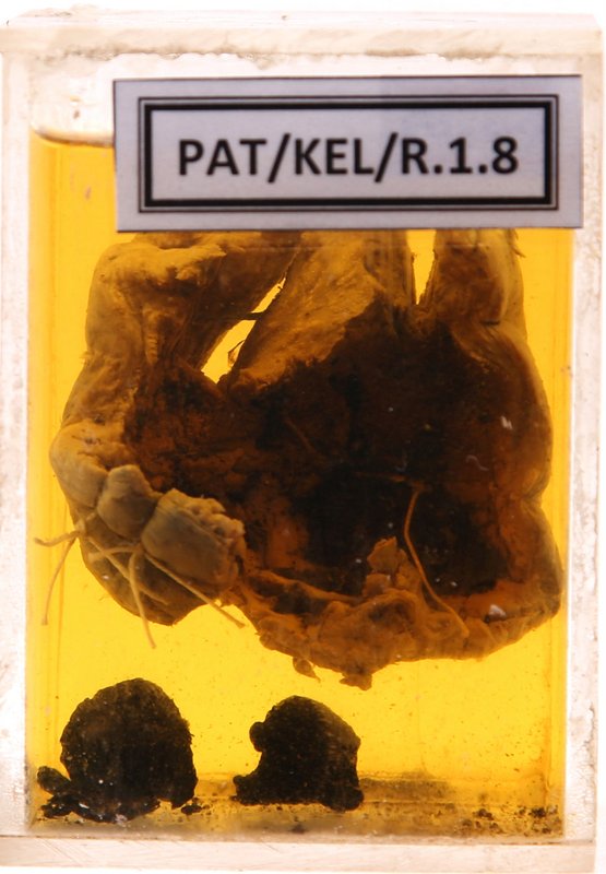 - Gall bladder is filled with black, crumbling stones and necrotic material.