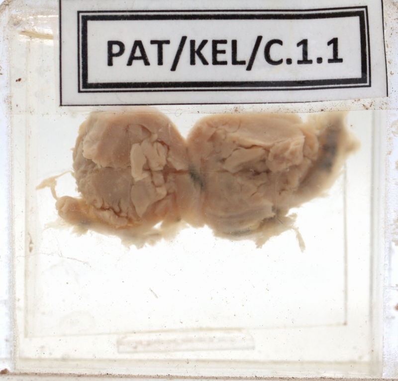 An enlarged lymph node with a homogenous yellowish cut surface.