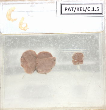 Two lymph nodes with a solid, homogenous cut surface.