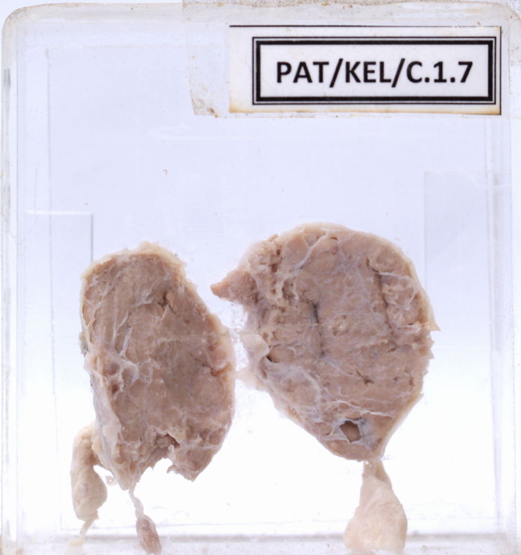 Irregular solid mass with a pale pink colored homogenous cut surface.