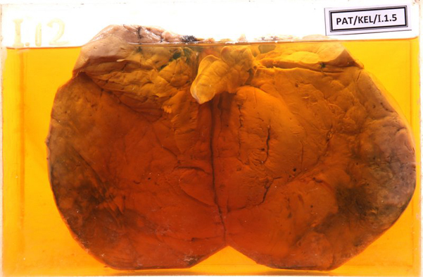 - The cut surface appears like ‘a cut potato’ except at the lateral border, there appears to be haemorrhage and necrosis.