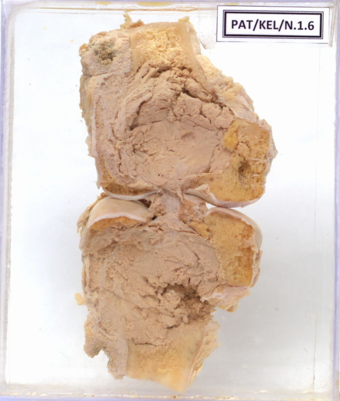 - The cut section shows markedly thinned out bony and cartilaginous margins enclosing a pale pink rather homogeneous soft tumour tissue.