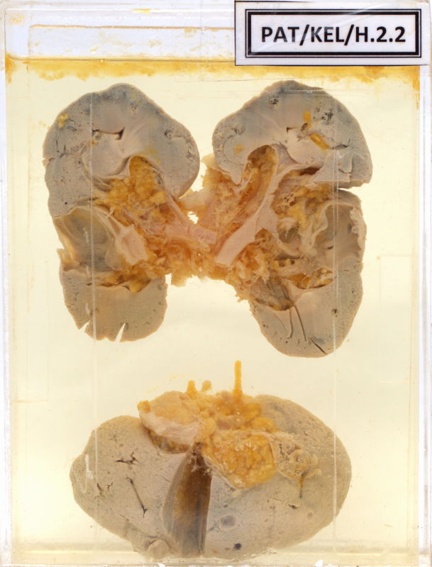 - The calyces and medulla are contracted and fibrosed showing fibrous streaking.