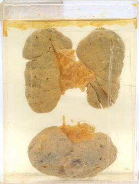 - The surface of the lower kidney shows a collapsed thin walled cyst in the middle part.