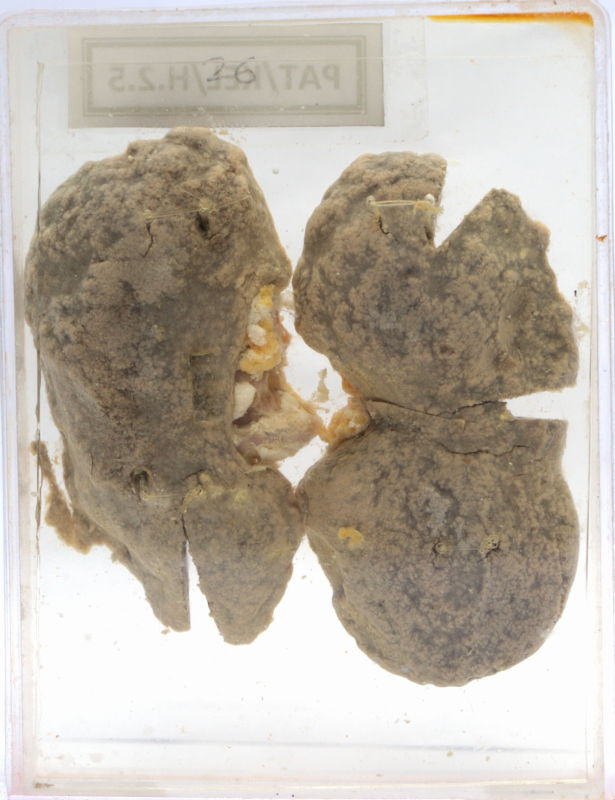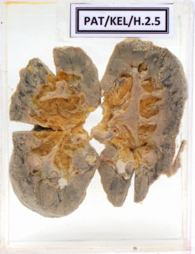 - Cortex and medulla show marked thinning and distortion, with fibrotic change.