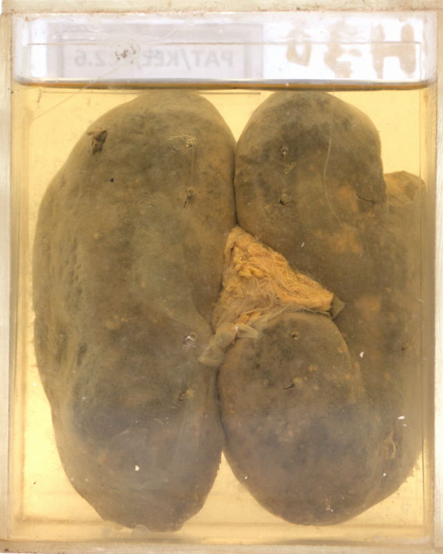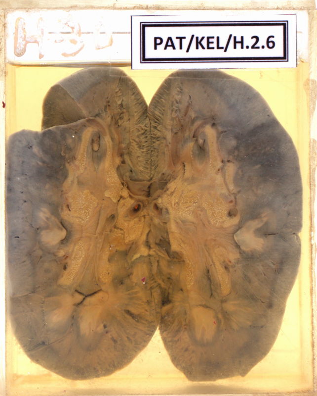 - Cortex appears to be bulging and compact. Medulla appears to be almost homogenous with pale areas.