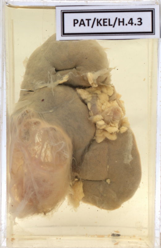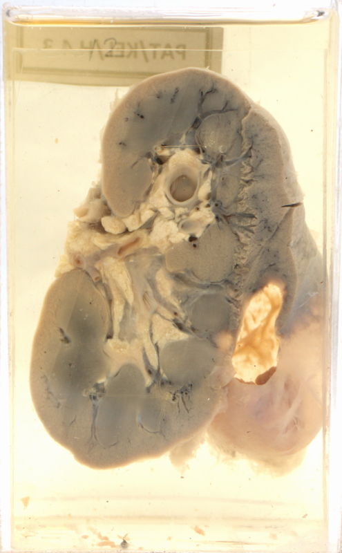 - There is a large thin walled cyst in the lower middle part of the kidney towards the periphery.