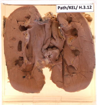- The cut surface shows dilated pelvis and calyces.